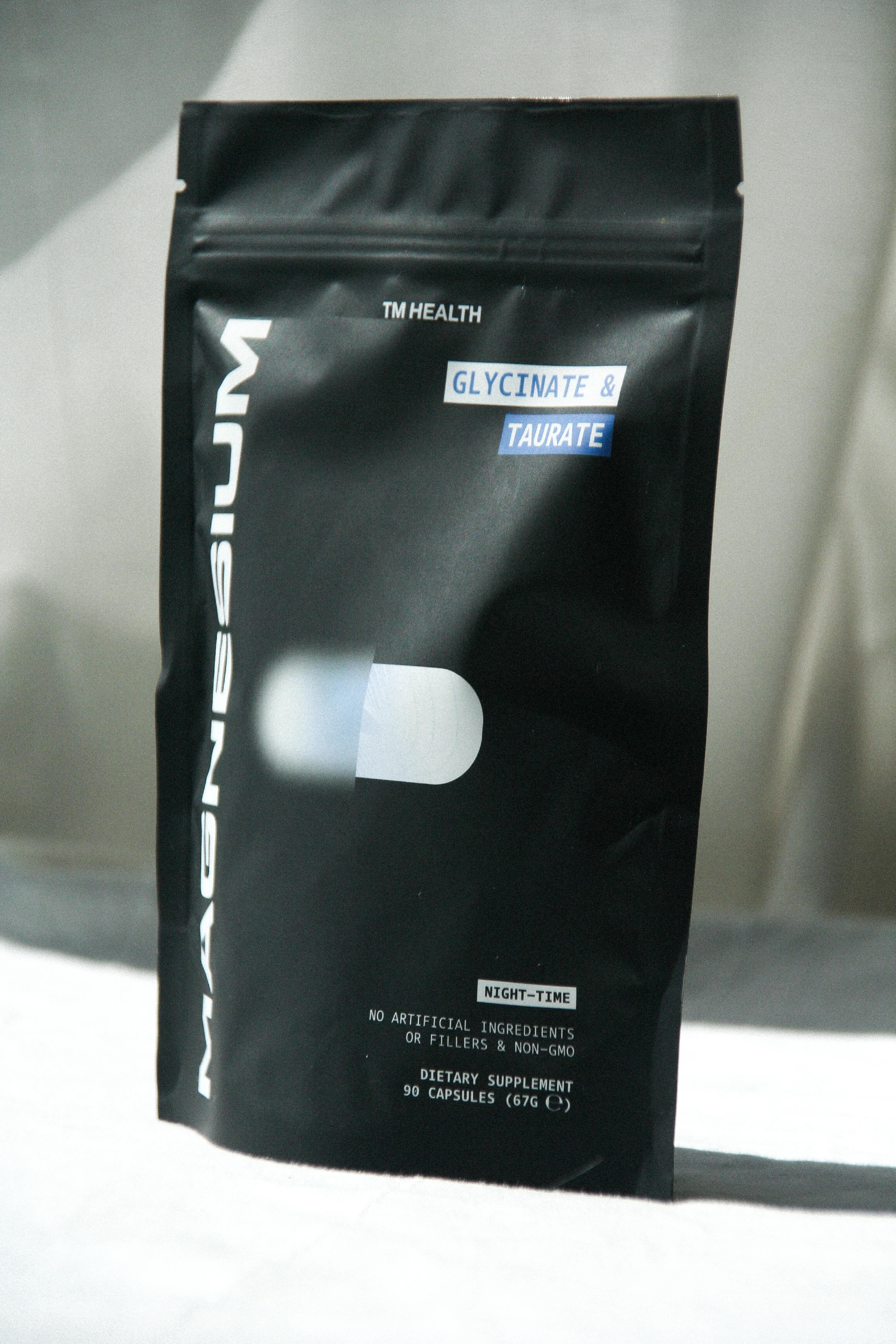 Thomas had een naam en een formule ontwikkeld. Dat was mijn startpunt. Een vrijwel leeg canvas. Maar juist dat pure, bullshit-vrije aspect van deze vraag én het product werd mijn leidraad. Want Thomas bedankt voor de onnodig slechte ingrediënten en E-nummers die onze voeding en supplementen tegenwoordig rijk zijn. De formule van Thomas voor TM Health bestaat uit slechts twee (!) ingrediënten, verpakt in een plantaardige capsule. Eén voor day-time en één voor je je mandje in kruipt. Niets meer, niets minder. Less is more was nog nooit zo relevant. En dat zie je terug in de verpakkingen.